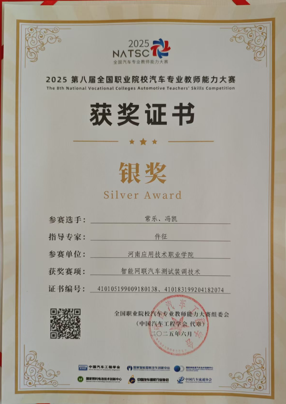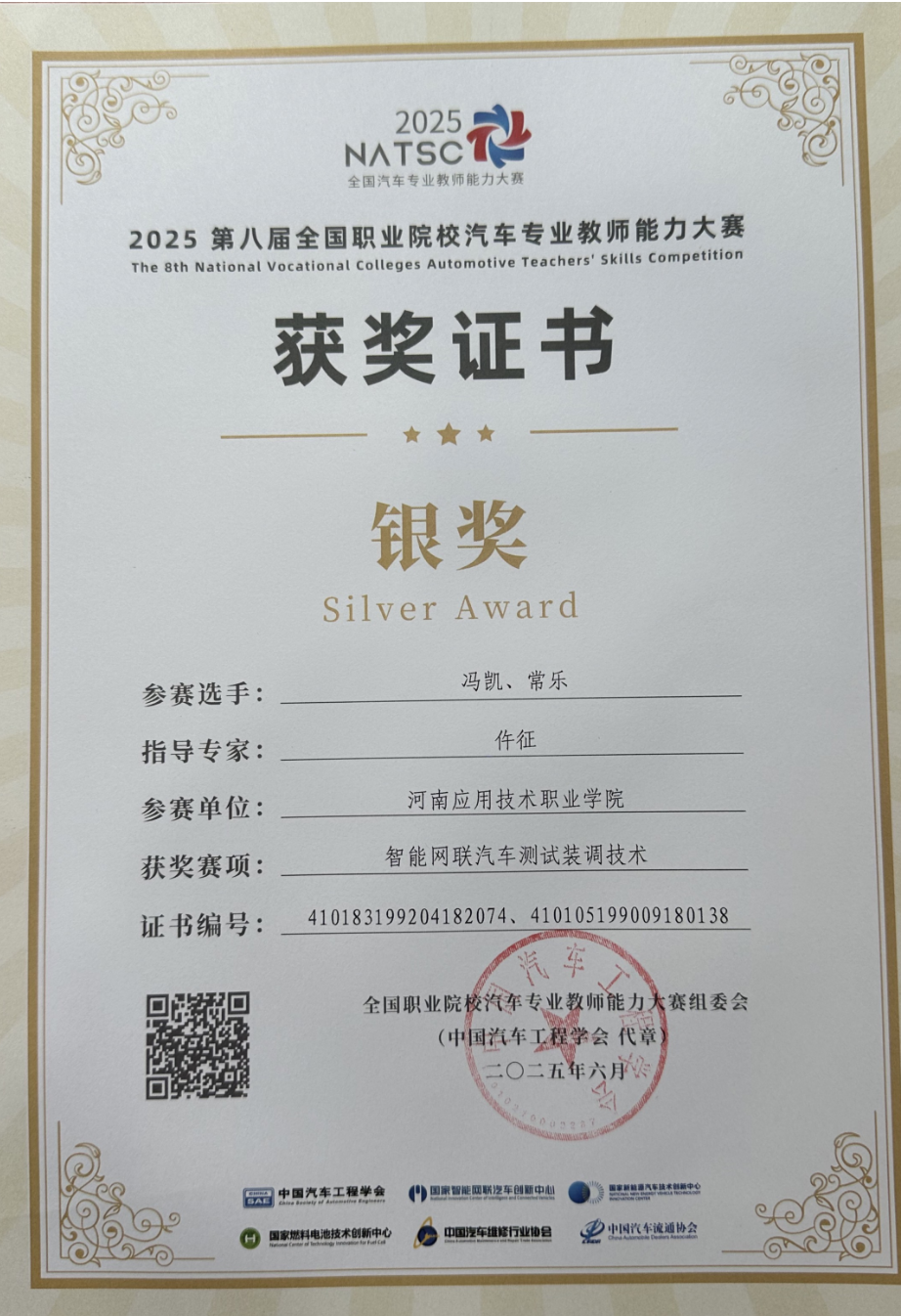 2025年6月22日,第八届全国职业院校汽车专业教师能力大赛“风向标杯”智能网联汽车测试装调技术赛项正式拉开帷幕,经过两天的激烈角逐,Beast中国官网教师冯凯、常乐老师在副院长仵征带队下获得高职组银奖。