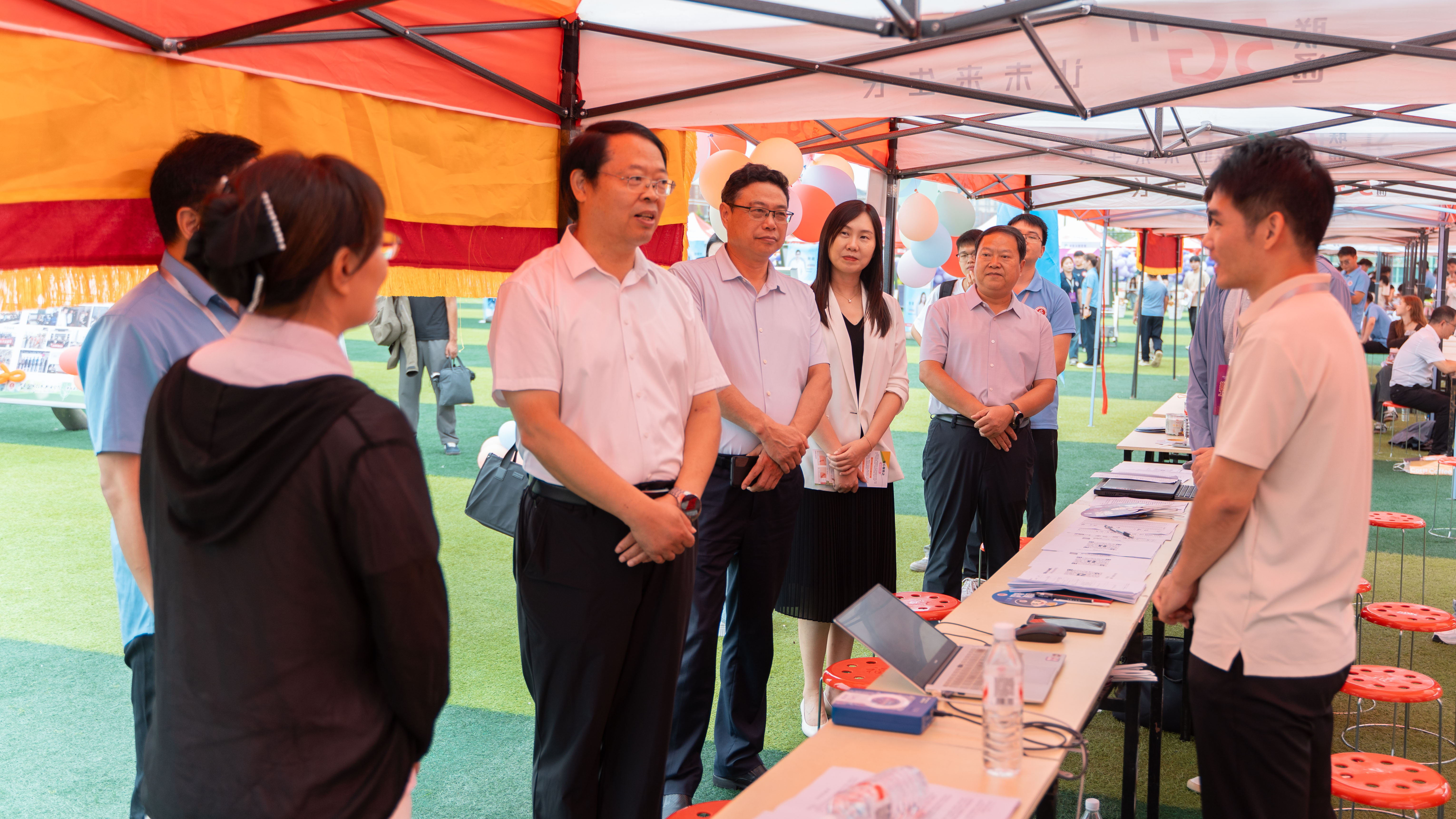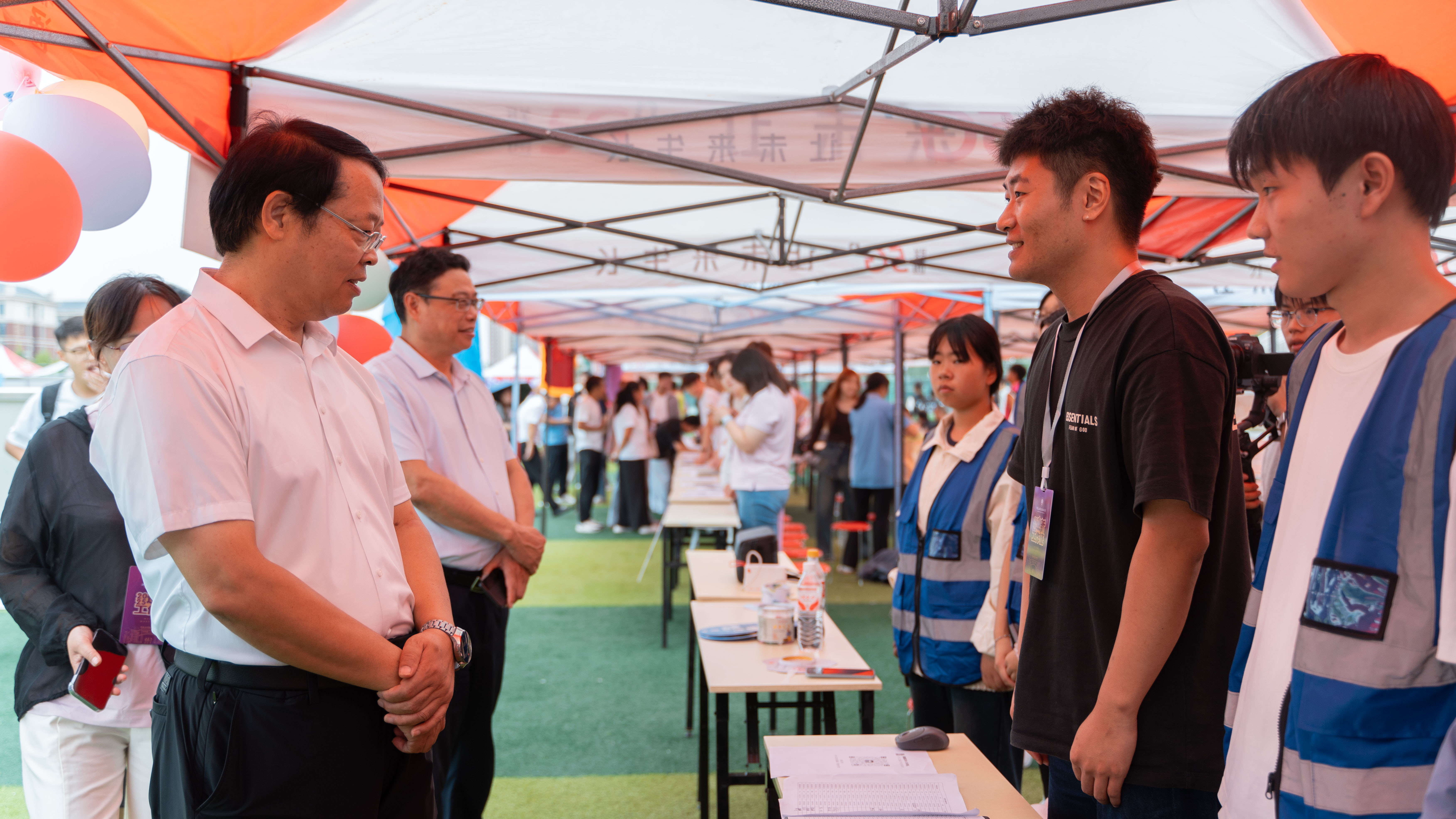 迎新现场气氛热烈,校党委书记闫俊山专程深入迎新一线,实地督导迎新工作开展。期间,学院党总支书记孙丽娜与副院长仵征共同向闫俊山详细汇报迎新工作,逐一说明细节;同时结合实时数据,汇报当日迎新进展,包括已报到新生人数、及新生和家长对现场服务的反馈意见。闫俊山对学院迎新工作的周密部署和高效推进给予肯定。